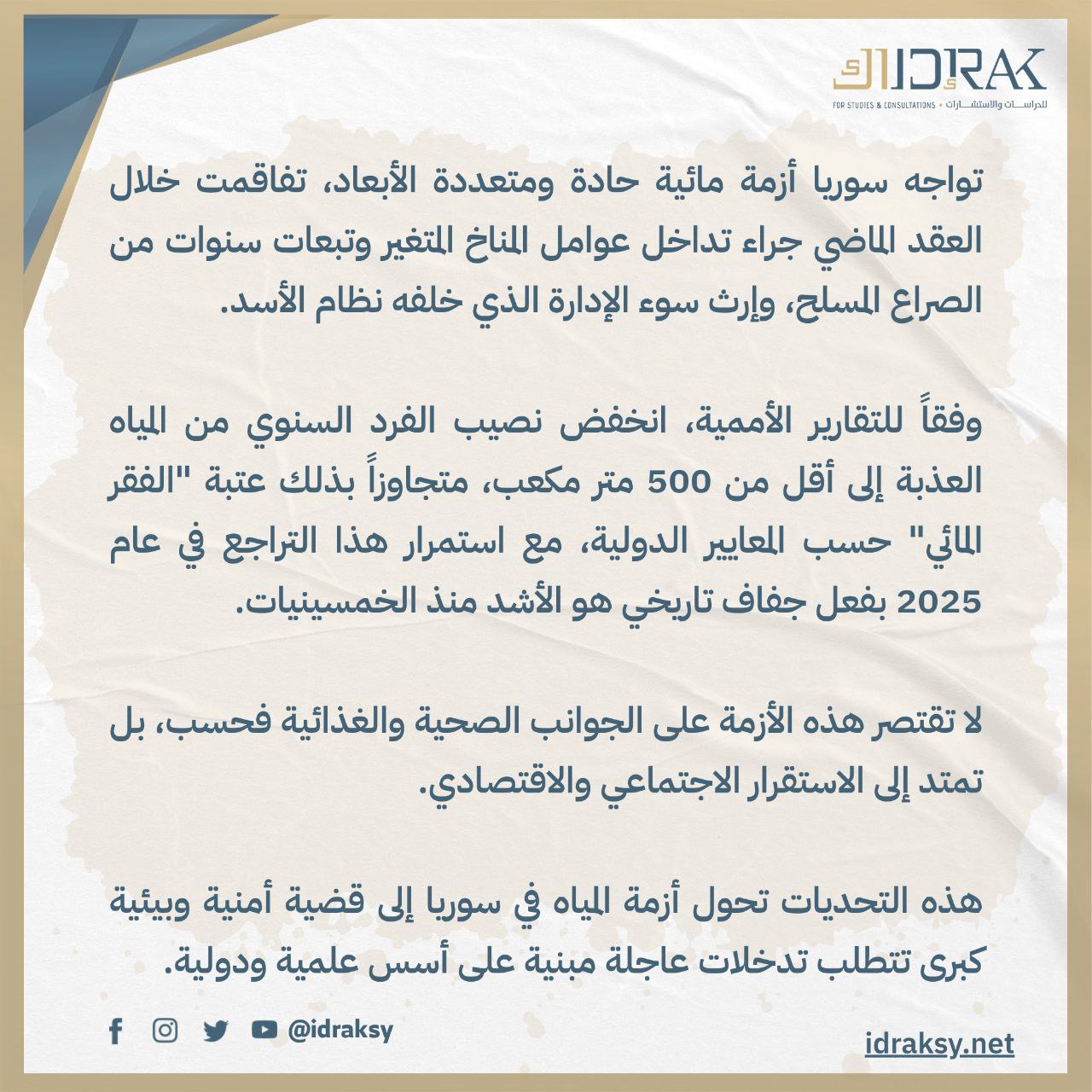 تواجه سوريا أزمة مائية حادة ومتعددة الأبعاد، تفاقمت خلال العقد الماضي جراء تداخل عوامل المناخ المتغير، النزاع المسلح المدمر، وسوء الإدارة المزمن للموارد. وفقاً لتقارير حديثة، انخفض نصيب الفرد السنوي من المياه العذبة إلى أقل من 500 متر مكعب، متجاوزاً بذلك عتبة “الفقر المائي” حسب المعايير الدولية، مع استمرار هذا التراجع في عام 2025 بفعل جفاف تاريخي هو الأشد منذ الخمسينيات.