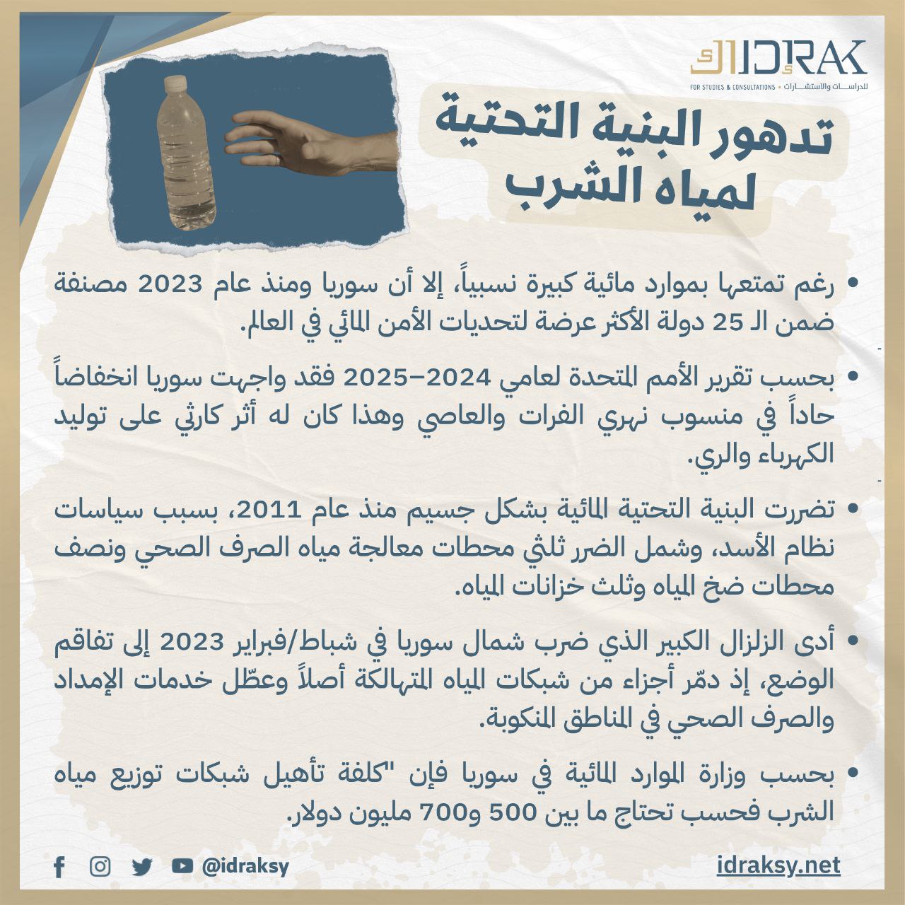 تقف أزمة قطاع المياه في سوريا اليوم عند مفترق طرق يتجاوز كونه أزمة إنسانية، ليصبح أزمة وطنية تمس الأمن الغذائي، الاستقرار الاجتماعي، ومقومات التعافي الاقتصادي. إن تضافر سنوات الجفاف المتكررة، وتدهور البنية التحتية، ونضوب المخزون الجوفي، جميعها عوامل تدفع بالبلاد نحو حافة الخطر المائي.