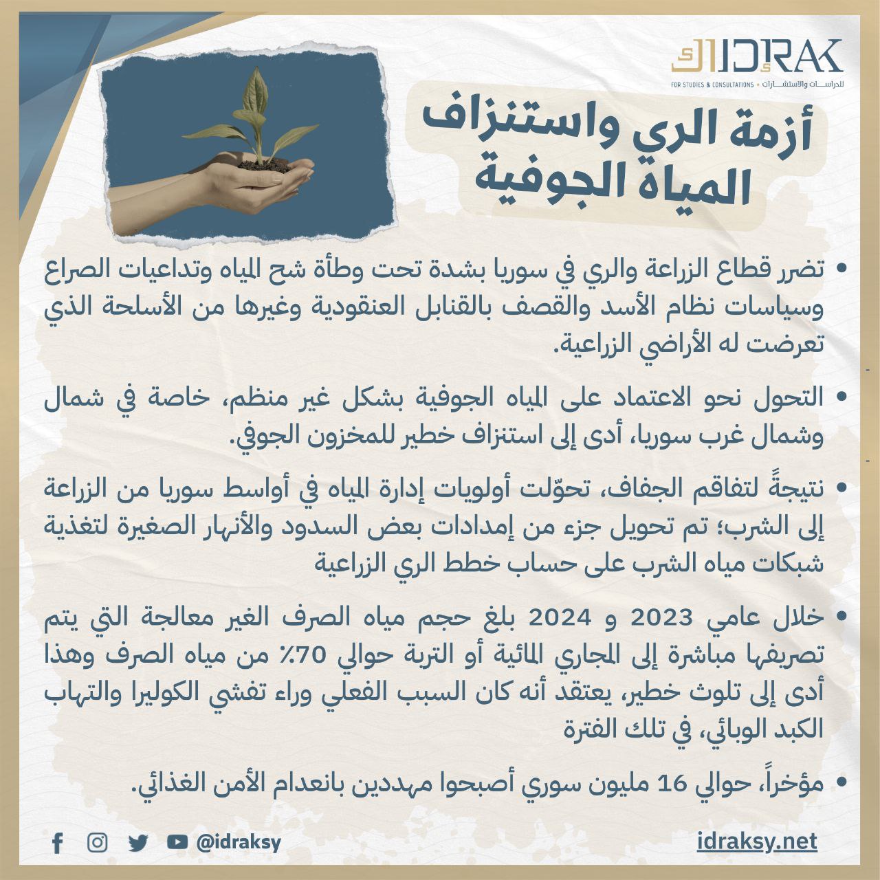 هذا الجفاف أدى إلى تراجع إنتاج المحاصيل الأساسية، مثل القمح، بنسبة تصل إلى 40%، مما يهدد أكثر من 16 مليون سوري بانعدام الأمن الغذائي، وفق تقديرات الأمم المتحدة، كما يعاني أكثر من نصف السكان من انقطاع منتظم في مياه الشرب الآمنة، إذ أدى الصراع وسياسات نظام الأسد، إلى خروج ثلثي محطات معالجة المياه ونصف محطات الضخ عن الخدمة، مع تفاقم الوضع بسبب تدمير البنية التحتية في 2025.